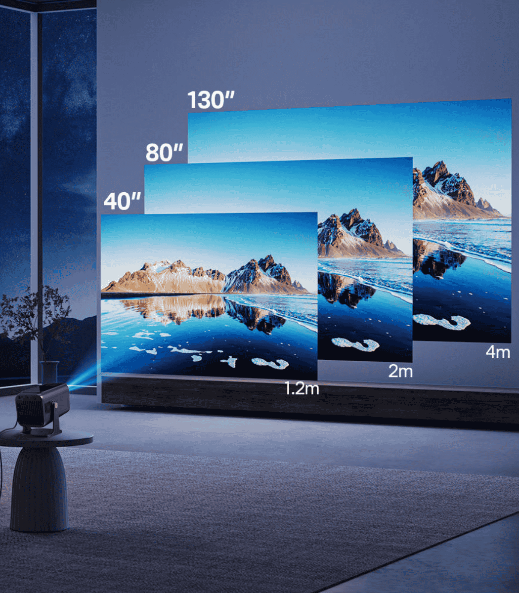 Projection Size & Distance – Adjustable screen from 60” to 150”, with projection distance from 1m to 4m.
