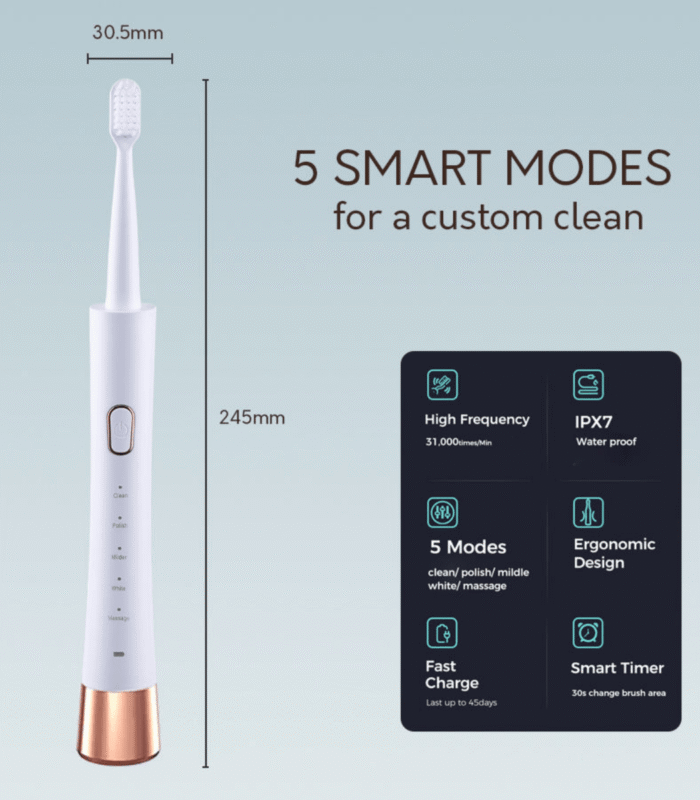 The LED Sonic Toothbrush is designed with advanced features to provide a thorough and effective cleaning experience. Its “W” shaped bristle design adapts to the natural contours of the teeth, reaching deep areas and ensuring gentle gum care. Made with high-quality DuPont bristles, it helps promote naturally whiter teeth by polishing away surface stains without causing irritation.
